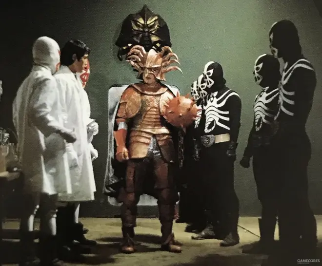 第三项升级则是反派的强大,作为能衬托得起V3强大的敌对组织,制作团队对迪斯特龙的特色刻画也颇为用心。初代《假面骑士》中修卡与盖尔修卡强调一个假面骑士中的核心概念,也就是“敌我同源”,无论是改造人还是怪人大多都是基于某种生物特性进行怪人化手术。为了彰显迪斯特龙更为强大,本作提出了机械怪人赛博格的构思。将生物与机械进一步融合强化,使得怪人拥有两者结合的复数战斗能力。从屏幕的视觉感官上来看,怪人的皮套不一味只追求还原生物原形,却是将无机物的机械质感特征以不规整的方式自由设计,脑洞之大上升了好几个纬度。