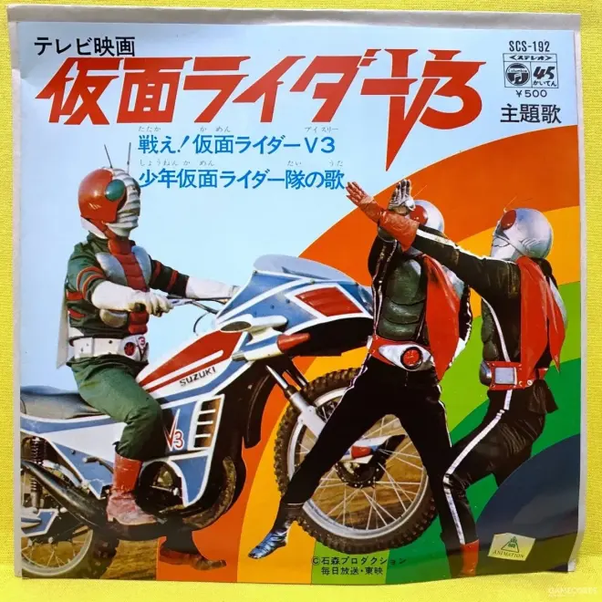 最后值得一说的是《假面骑士V3》的主题歌,《戦え! 仮面ライダーV3(战斗吧!假面骑士V3)》也是一首非常洗脑上头的经典名曲,与初代《假面骑士》主题曲《レッツゴー!! ライダーキック》一样,是一首大卖的歌曲。这首歌曲是菊池俊輔负责作曲,石森章太郎担当作词,由风见志郎的演员宫内洋亲自演唱。歌词与旋律与剧情息息相关,旋律琅琅上口,时至今日依旧非常耐听。旋律一响,回忆满载。