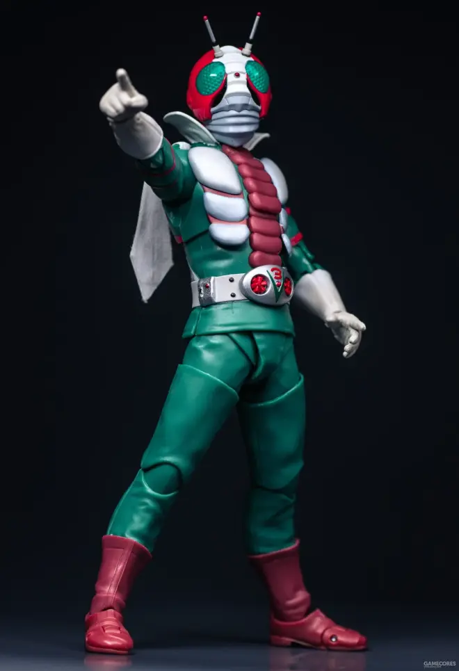 + 造型还原,假面骑士V3最大的优点就是还原了角色在剧中的皮套设计,无论是身材比例,还是套在角色身体外层的皮套尺寸,商品都进了彻底还原,表现出了其服装设计的层次感。头盔的红色漆面,绿色复眼,领口与背部的披肩都一一还原。不细究的话,第一眼体验还不错。
