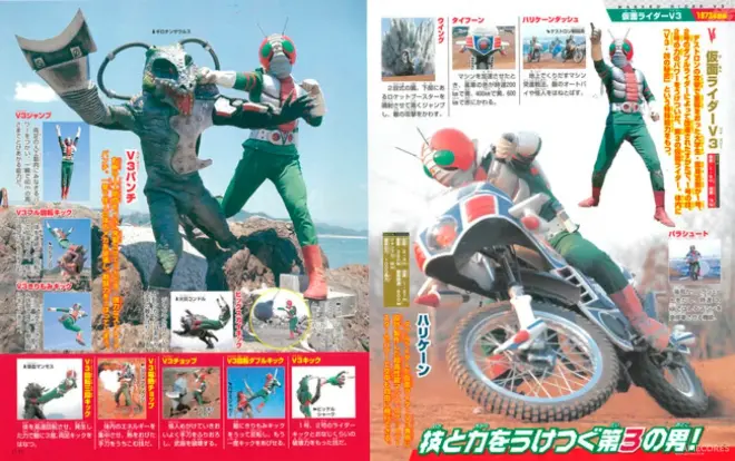 《假面骑士V3》于1973年2月17日开始,每周日晚上19:30 - 20:00在每日放送电视台进行播放的特摄英雄电视剧。全剧共计52话,翌年1974年2月全部播送完毕。《假面骑士V3》属于假面骑士系列IP中的第二作,直接承接前作《假面骑士》的世界观,是同一时间线后续的故事作品。除了电视台放送的电视剧以外,也有东映制作的剧场版电影。