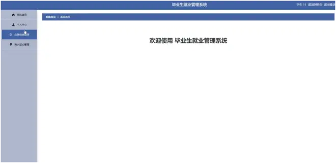 辅导员登录进入系统,在辅导员主页面,主要包括对系统首页、个人中心、学生管理、应聘信息管理、确认签约管理、就业总结管理等功能进行操作。辅导员主页面如图5-11所示: