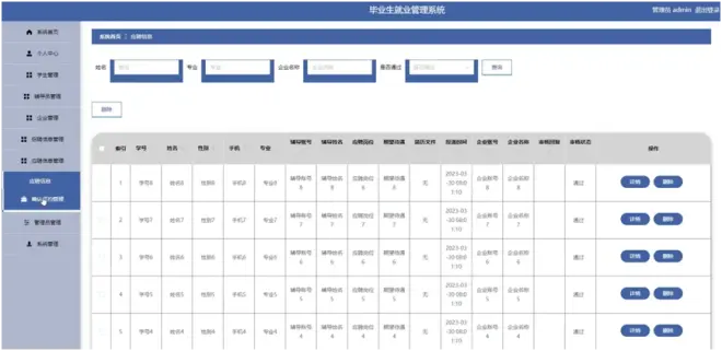 管理员点击应聘信息管理;在应聘信息管理页面对学号、姓名、性别、手机、专业、辅导账号、辅导姓名、应聘岗位、期望待遇、简历文件、投递时间、企业账号、企业名称、审核回复、审核状态等信息,进行查询或删除应聘信息等操作;如图5-7所示。