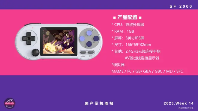 本周,销售商“数码蛙 Data Frog”面向海外市场发售了低端怀旧游戏掌机SF2000。其搭载一块未知名的双核处理器和1GB运存。3英寸IPS屏幕,1500毫安电池最多可以游玩6小时。可以游玩GBA、MAME等7种怀旧平台。海外售价23.77美元,国内售价85元。