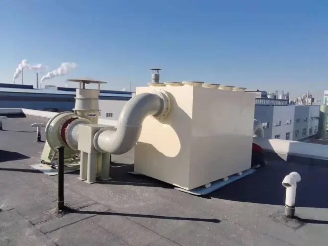 四是防腐风机应安装在室外屋顶,出风口设防雨、鸟罩,还有减震器、逆风阀、消音器。