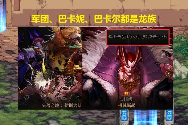 二是现阶段副本依旧以“巴卡尔/巴卡妮”为主,次一等也是龙人军团,这两个副本都是“龙族怪物”,所以选择龙族8技攻可全程触发也毫无问题。