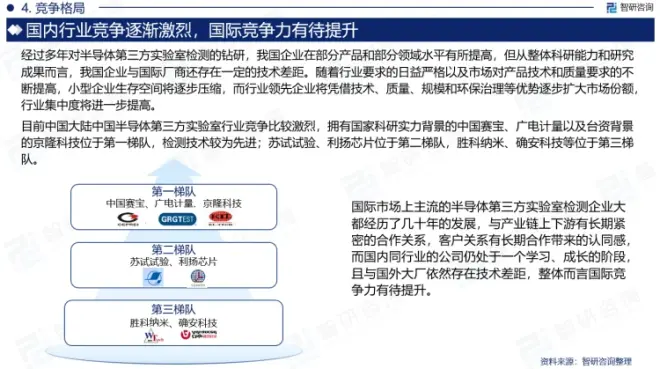 目前中国大陆中国半导体第三方实验室行业竞争比较激烈,拥有国家科研实力背景的中国赛宝、广电计量以及台资背景的京隆科技位于第一梯队,检测技术较为先进;苏试试验、利扬芯片位于第二梯队,胜科纳米、确安科技等位于第三梯队。