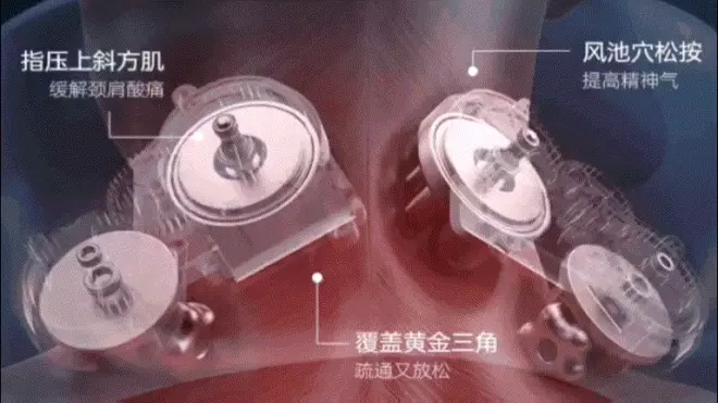 完美覆盖上斜方肌、风池穴、大椎穴等关键部位。同时科学四芯梯形矩阵排布的设计,也是通过数万真人实验实测,确保使用中不会误按骨头和动脉,确保安全保障。