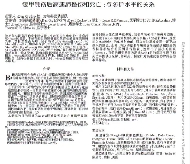 上面的《不同弹体结构步枪弹致防弹衣后钝性伤特点及其生物力学机制》就引用了下面这篇国外论文