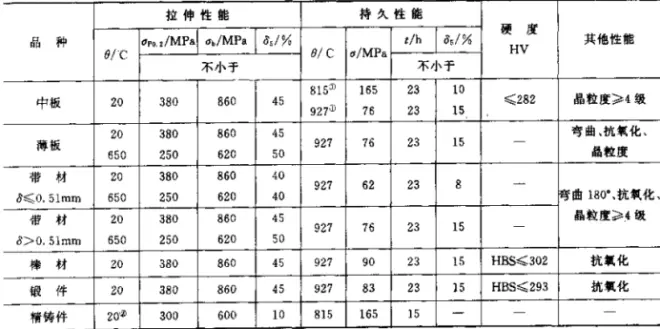 1.8 应用概况与特殊要求 该合金在国外广泛用于制造燃气涡轮和导弹等高温部件,如燃烧室、尾喷管以及核能工业中的热交换器等零部件。在国内,使用该合金制造的航空发动机燃烧室火焰筒和导向叶片等高温部件已经通过长期的试车考验并投入生产应用。在使用该合金板材加工成零件的制造工艺中,任何工序(例如热处理、焊接等)都应该注意防止渗碳和铜污染,以免损害合金的力学性能和耐蚀性能。