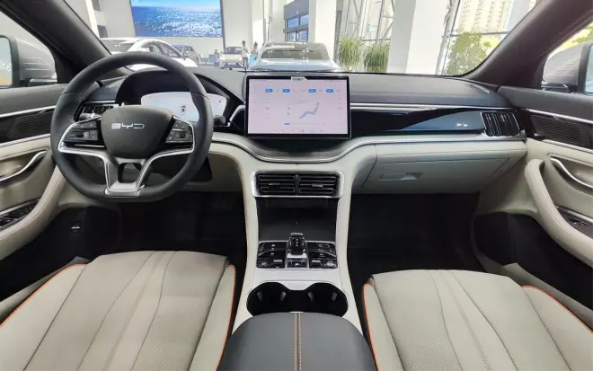同时,比亚迪宋PLUS DMi冠军版的车机系统功能也非常强大,为驾驶者提供了出色的操作体验。搭载的12.8英寸中控屏幕和12.3英寸全液晶仪表不仅给人强烈的视觉冲击,营造出浓厚的科技氛围,而且功能丰富。内置的Dilink智能车机系统为驾驶者提供了便捷的操作方式。支持语音控制和手机远程遥控,让驾驶者可以通过简单的语音命令或手机操作实现多项功能。这使得驾驶者可以专注于驾驶,同时享受到智能科技带来的便利。在行车过程中,通过语音命令,驾驶者可以将中控屏幕上的导航直接显示在全液晶仪表上,使得导航信息更加清晰明了。这种创新的设计使驾驶者无需分神查看中控屏幕,便能轻松获取导航指引,提供了更安全、便捷的驾驶体验。