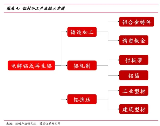 再生铝为原料,通过挤压、铸造、轧制等工艺加工为铝型材、铸造材、铝板带箔等产
