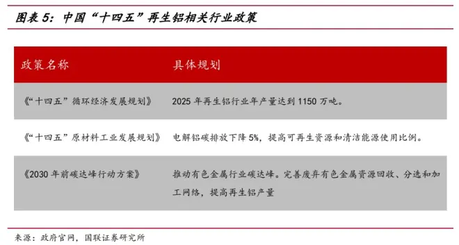 再生铝政策端持续发力。铝行业属于资源再生和循环经济范畴,行业的健康发展对于中国建设生态文明、推动绿色发展有重大的战略意义,近年来,国家相继出台多个政策性文件,大力支持循环经济、再生金属行业的发展,预计到 2025 年,中国再生铝行业年产量达到 1150 万吨