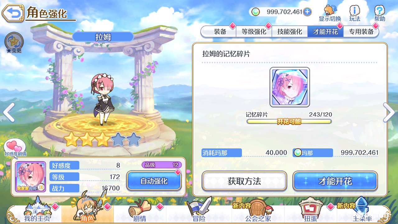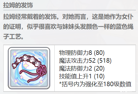 可提供物理防御力、魔法攻击力、魔法防御力、技能值上升,对于打竞技场来说,都是重要属性。强化至180级,可获得80点物理防御、、20点魔法防御,518点魔法攻击力和10点tp上升,主要是专武有tp上升效果,高强度竞技场,玩家可直接把他拉满,普通玩家的话,开专或强化至30即可,把活动送的碎片优先保证拉姆的星级。