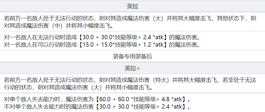 普通1技能会对一名敌人在无法行动时造成【30.0 + 30.0*技能等级+ 2.4 *atk】的魔法伤害。对一名敌人在可以行动时造成【15.0 + 15.0*技能等级+ 1.2 *atk】的魔法伤害。