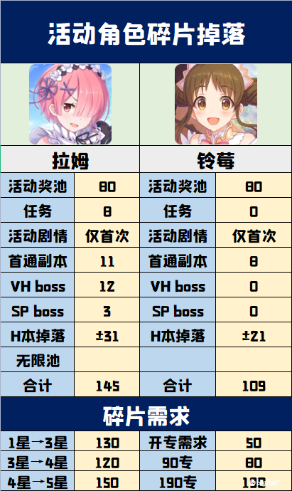 拉姆是赠送的1星角色,推过活动1-15图就能获得,本次规划按每日一刀杀vh boss,5刀内杀sp boss,每日只刷1、3、5三个困难本(按每天2.6片的期望计算),在活动结束的时候,最次最次可以获得145片拉姆的碎片。这个145片并没有算上无限池,如果你们还需要更多的碎片,那么就看看自己要刷多少个无限池就行了。