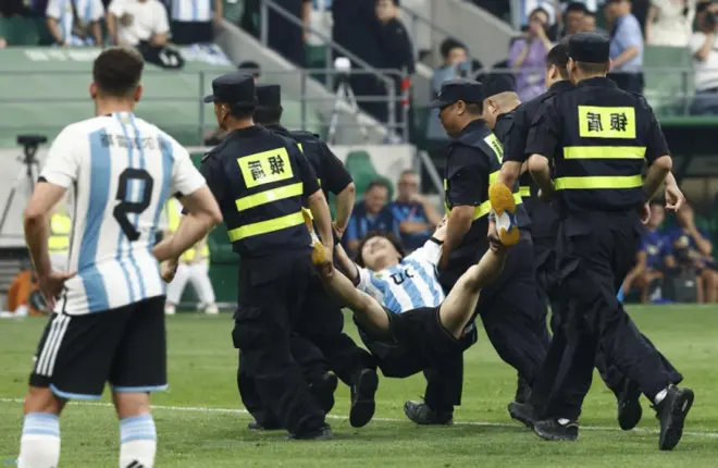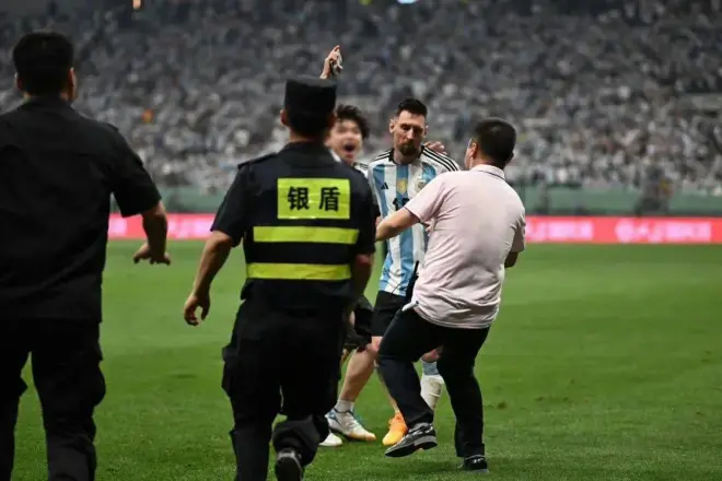 昨晚,梅西领衔的阿根廷队与澳大利亚队在北京工体举办友谊赛。比赛过程中,一个中国小伙突然闯入球场,拥抱梅西,并在球场奔跑狂遛保安近5分钟。此事的关注度瞬间攀升,一度超越了对比赛本身的关注。