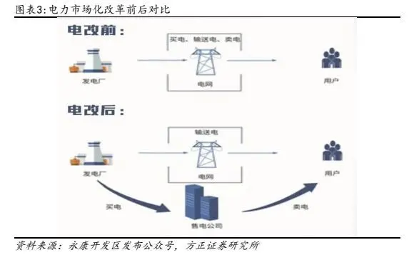 电力市场化改革的核心内容是“管住中间,放开两头”,用价格引导用户合理用电。“管住中间”是指改革后电网企业按照核定的输配电价收取过网费,不再以购销差价来做主要的收入来源。“放开两头”则是指:1)放开电源:燃煤发电电量原则上全部进入电力市场,通过市场交易在“基准价+上下浮动”范围内形成上网电价,上下浮动范围不超过 20%。2)放开用户:工商用户全量进入市场,取消工商业目录销售电价,按市场价格购电,居民、农业用电不变。
