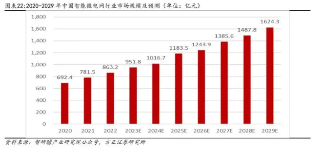 微电网的提出旨在实现分布式电源的灵活、高效应用,解决数量庞大、形式多样的分布式电源并网问题。微电网是指多个分布式电源及其相关负载按照一定的拓扑结构组成的网络,通过静态开关关联至常规电网。开发和延伸微电网能够充分促进分布式电源与可再生能源的大规模接入,实现对负荷多种能源形式的高可靠供给,是实现主动式配电网的一种有效方式,使传统电网向智能电网过渡。根据智研瞻产业研究院测算,到 2029 年,中国智能微电网行业市场规模将达到 1624.3 亿元,相较于 2020 年将近翻了一倍。我们认为,微电网是实现分布式发电技术大规模应用、有效提高系统供电可靠性的一种新型自治电力系统,在政策持续催化以及电力用户需求倒逼下,未来或将上探更高成长空间。