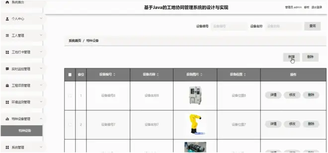 管理员点击特种设备管理。在特种设备页面输入设备编号和设备名称进行查询、新增或删除特种设备列表,并根据需要对特种设备详细信息进行详情、修改或删除操作。如图5-14所示: