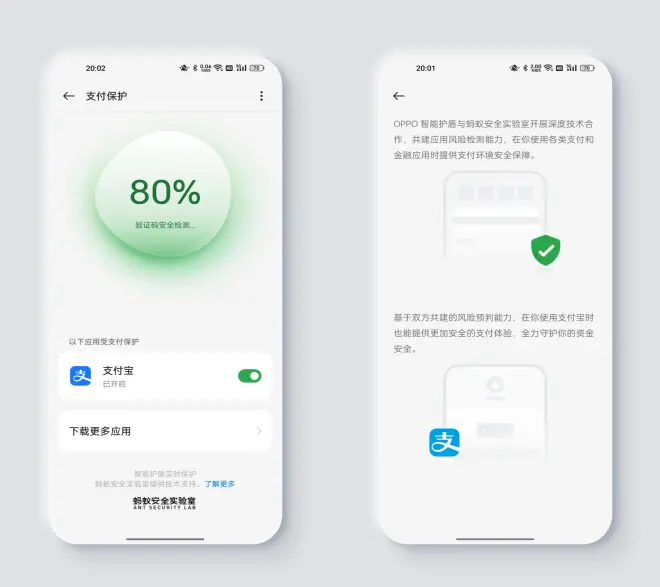 移动支付这个涉及金钱的领域,ColorOS 13的防护更加用心。ColorOS与蚂蚁安全实验室强强联合,共建金融级恶意代码识别引擎。当我们进行支付操作的时候会提前识别风险,发现问题及时解决。人脸识别、指纹识别这些敏感又重要的生物信息将隔离在TEE可信执行环境,让用户每一笔交易都安心。