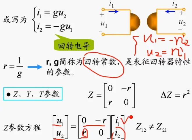 ① 回转器是一种线性非互易的多端元件,而理想回转器可视为一个二端口,它的端口电压、电流关系可用下列方程表示.,其中r(回转电阻)、g(回转电导)简称回转常数,它们的关系为r=1/g