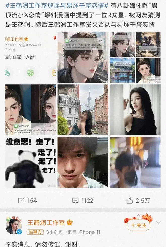 7月7日,八卦媒体用漫画的形式,曝出娱乐圈男顶流的大瓜,让网友瞬间炸锅。八卦媒体爆料,以往都是晒视频或者照片,这次可好,晒出一堆漫画,让大家看图说话,还挺新鲜。不过,还是提供一些重要信息,该顶流男团出道,气质独特,少有绯闻,拍戏时结识一位比自己大6岁的R女演员。按理说,仅凭借爆料中的信息,很难知道这位男顶流和女演员到底是谁?然而,一些网友硬生生的猜测是易烊千玺和王鹤润。更让人没想到的是,随后,王鹤润工作室发文辟谣与易烊千玺的恋情,咱就说,这么一否认,不是明摆着说爆料中的男星是易烊千玺?另外,易烊千玺并没有回应此事,王鹤润辟谣恋情,让男艺人显得非常尴尬。一些网友纷纷表示:这下可好,压力给到了易烊千玺。都说娱乐圈的事并非空穴来风,不过,网上的爆料也未必可信,希望大家理性吃瓜