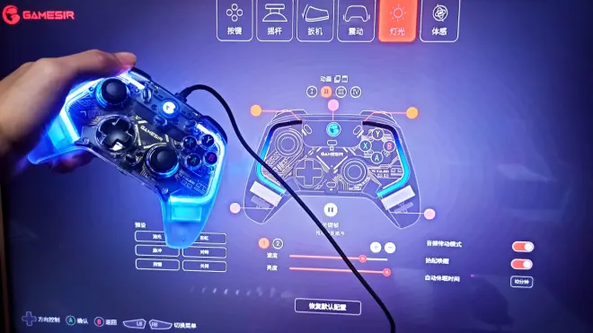 无光效不游戏,在“GameSir T4K”里可以对盖世小鸡T4幻境版游戏手柄的光效进行详细设置,5哥区域、1680万可编程幻彩光纤,开启音频同步模式并插入耳机后光效可随音频大小自动调节亮度,M+左摇杆左右切换出厂的4种灯效,M+左摇杆上下调整灯光亮度,App里面4个动画都可以根据个人喜好自定义进行设置。