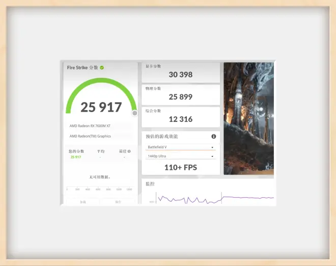 先说结果,该机搭载的 AMD Radeon RX 7600M XT 移动显卡在 3DMark Time Spy 基准测试中可以达到英伟达同级竞品 GeForce RTX 4060 的水平,而在 Fire Strike 中还快了 14.8%。