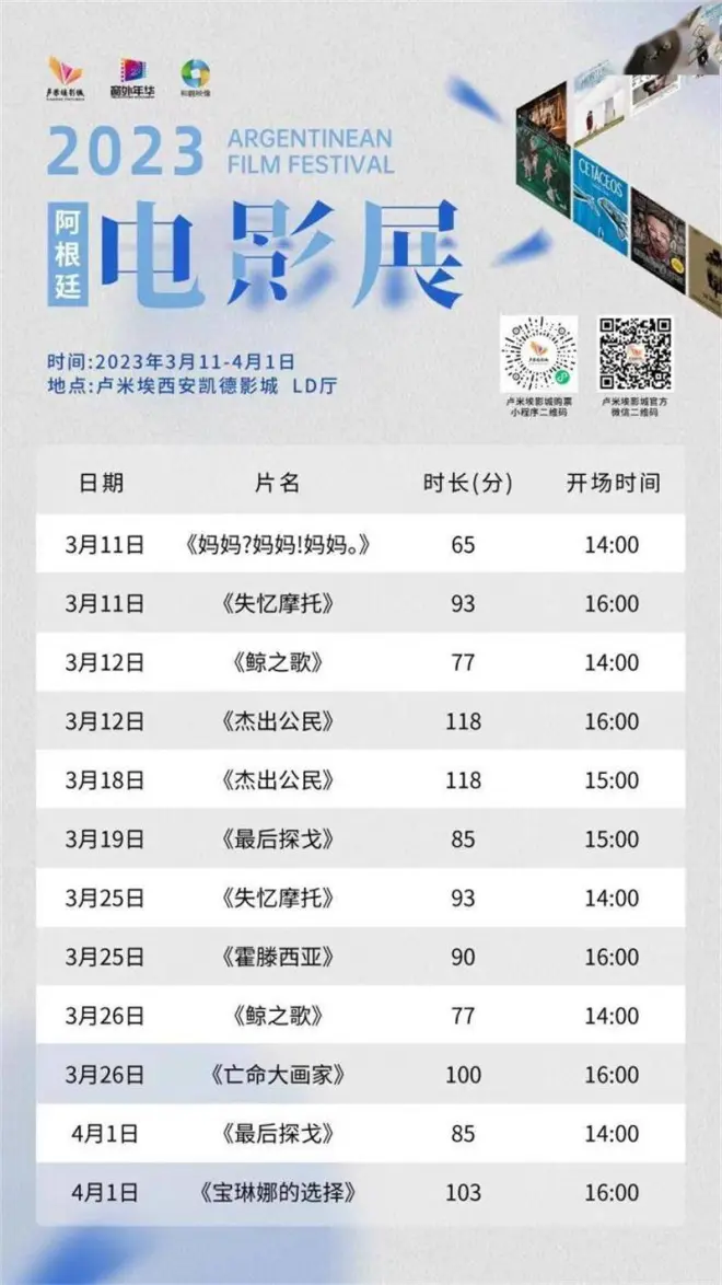 阳光讯(记者 范启彬)“2023阿根廷电影展”由卢米埃影业携手窗外年华、和观映像倾力推出,将于2023年3月11-4月1日,在卢米埃西安凯德影城和卢米埃西安曲江创意谷IMAX影城展映,预售已开启,抓紧抢票。