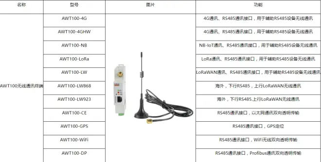 AWT100数据转换模块是安科瑞电气推出的新型数据转换DTU,通讯数据转换包括 2G、4G、NB、LoRa、LoRaWAN,GPS,WiFi,CE,DP 等通讯方式,下行接口提供了标准RS485数据接口,可以方便的连接电力仪表、RTU、PLC、工控机等设备,仅需一次性完成初始化配置,就可以完成对MODBUS设备的数据采集;同时AWT100系列无线通讯终端采用了功能强大的微处理芯片,配合内置看门狗技术,性能可靠稳定。安科瑞电气股份有限公司厂家王金晶,13/+77-443-/09+92,或者请您Acrel-Wangjinjing