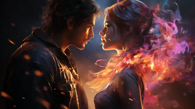 a red contrail is connecting a handsome young swordsman and a beautiful young witch, subtle love, luminescent lighting, highly detailed, 8k --ar 16:9 --niji 5