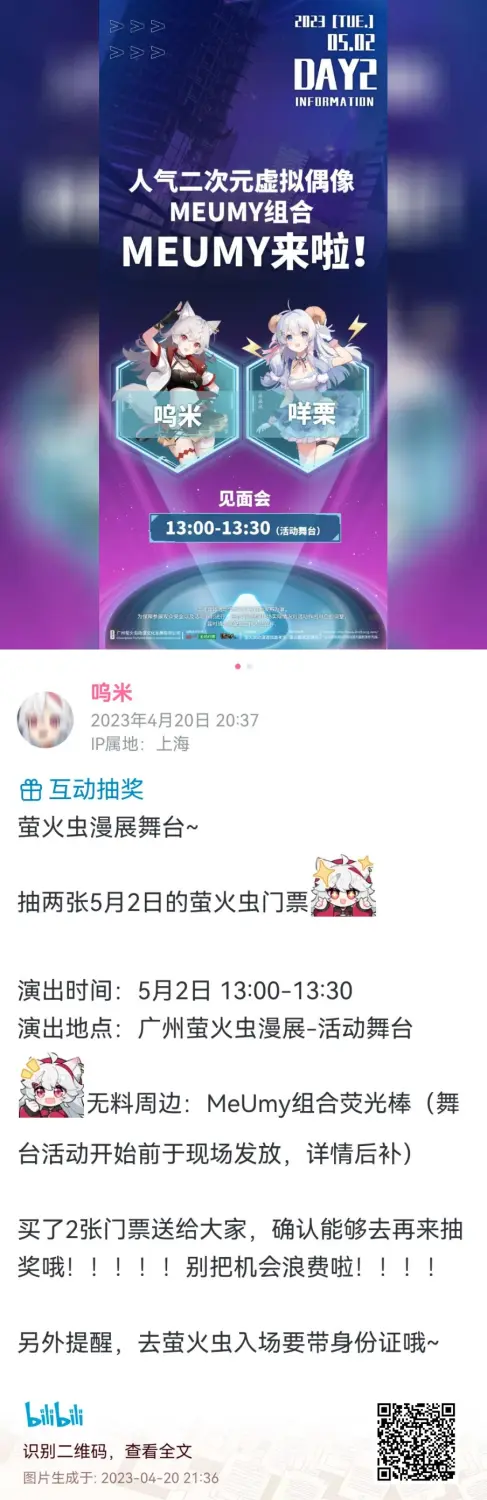 4月20日,呜米宣布meumy将于5月2日13:00-13:30于广州萤火虫漫展活动舞台进行演出,届时还将发放meumy荧光棒。