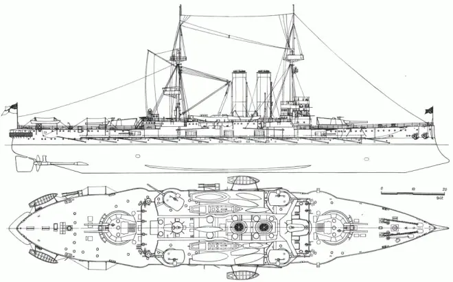 武备:双联装305mm/40倍径炮×2,单装234mm/45倍径炮×4,152mm/45倍径炮×10,76mm炮×14,47mm炮×14;鱼雷457mm×4;