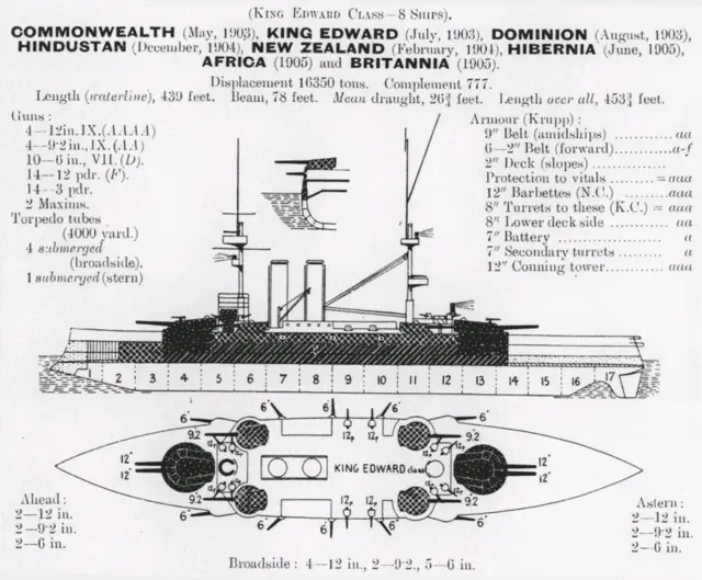 爱德华七世(King Edward VII) 号:由德文波特船厂建造,1902.3.8动工,1903.7.23下水,1905.2作为大西洋舰队的旗舰服役,1909.3-1911.7担任本土舰队旗舰。一战爆发时短暂进入地中海舰队,返回本土后主要用于本土对北海方向的警戒。1916.01.016在瑞斯角触雷受伤,在被拖往港口途中发生倾覆沉没。
