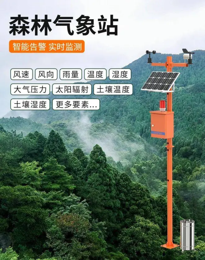 森林防火预警监测系统里的森林防火气象站中的各类传感器能够实时采集森林内的降水量、蒸发量、风速、风向、空气温/湿度、太阳辐射、各项土壤要素等信息(监测要素可以根据用户需求随意搭配),并将数据上传至环境监控云平台。