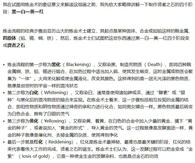 在很早的时候,就有人觉得,这些id并没有什么具体含义,但是实际上,他们暗示的是炼金术活动的过程,是伟大工作的历程。