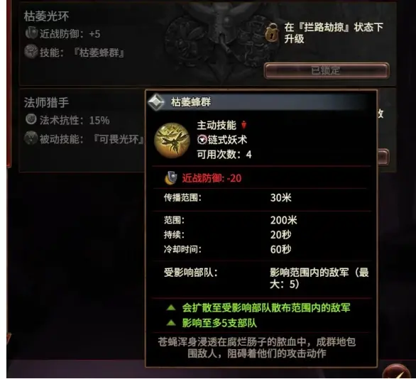 这个应该是混勇人物通用的荣耀之路,效果很不错,给了10点远抗和混沌护甲的被动,可以加自身20远程格挡和28近战反弹,非常适合单体聚怪。注意一点,这个远抗加成会随着人物的升魔而提升效果,如果是亲王领主的话,就能提供25%的远抗加成,叠叠乐组件之一。而且解锁条件很简单,打败有五只远程部队的敌军就行,不过需要你作为进攻方才可以解锁。