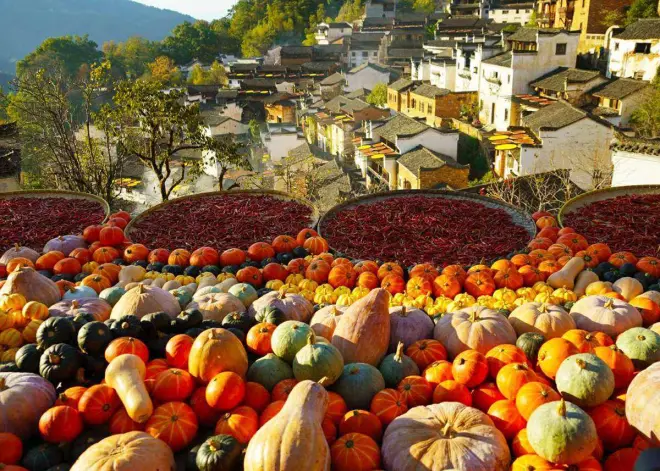 晒秋是指百姓把秋天收获的农作物,摊放在房前屋后的平台、空地进行晾晒,方便储存粮食作物,在过冬时不会发霉变质。