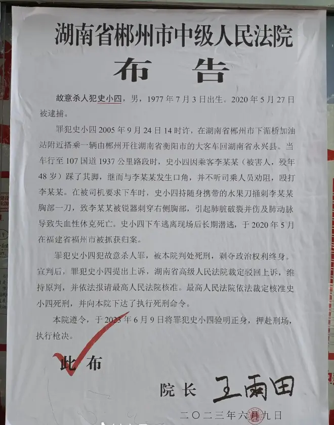 ,男,1977年7月3日出生。2020年5月27日因本案被捕。 罪犯史小四2005年9月24日14时许,在湖南省郴州市下湄桥加油站附近搭乘一辆由郴州开往湖南省衡阳市的大客车回湖南省永兴县。当车行至107国道1937公里路段时,史小四因乘客李某某(被害人,殁年48岁)踩了其脚,继而与李某某发生口角,并不听司乘人员劝阻,殴打李某某。在被司机要求下车时,史小四持随身携带的水果刀捅刺李某某胸部一刀,致李某某被锐器刺穿右侧胸部,引起肺脏破裂并伤及肺动脉导致失血性休克死亡。史小四下车逃离现场后长期潜逃,于2020年5月在福建省福州市被抓获归案。 罪犯史小四犯故意杀人罪,被本院判处死刑,剥夺政治权利终身。宜判后,罪犯史小四提出上诉,湖南省高级人民法院裁定驳回上诉,维持原判,并依法报请最高人民法院核准。最高人民法院依法裁定核准史小四死刑,并向本院下达了执行死刑命令。 本院遵令,于2023年6月9日将罪犯史小四验明正身,押赴刑场,执行枪决。