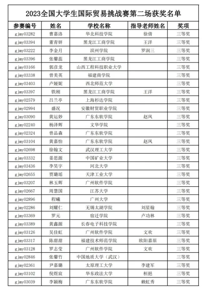 本次竞赛为个人知识赛,系统答题方式,主要考核国际贸易理论与实务方面的相关知识。竞赛奖项,参赛选手奖,设一、二、三等奖以及优秀奖,一二三等奖占参赛总人数的50%。一等奖获奖数量占参赛总人数的10%。二等奖获奖数量占参赛总人数的15%。三等奖获奖数量占参赛总人数的25%。荣誉证书:本赛段获奖选手可免费获得主办单位颁发的纸质版荣誉证书,未获得奖项的将获得电子版参赛证明。以下是2023全国大学生国际贸易挑战赛第二场获奖名单的通知: