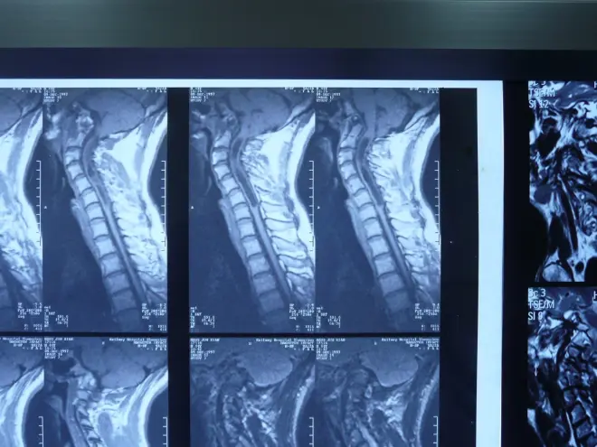 男,44岁。双手、上臂无力三年,进行性加重。颈椎MRI显示:小脑扁桃体下疝进入颈椎管,颈2-7节段脊髓中央管扩大。患者颈部短小。诊断:Chiari畸形,伴颈髓空洞。