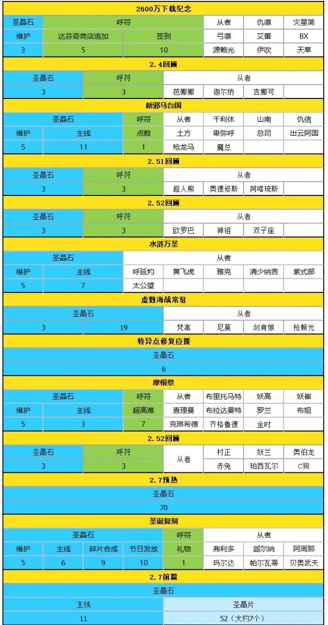 全年可获得的圣晶石是1360个,呼符是133个,折算成圣晶石就是399个,加起来是1759个,加上全年的签到、周常和每月呼符折算下来也有一千个左右,所以全年的圣晶石大概有两千到三千个,根据之前的全年对比,现在的圣晶石获取还是比之前多了500个以上的,不过卡池确实也增加了许多,入不敷出,还是得好好规划。