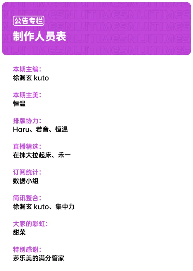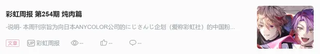 本周刊的制作宗旨为: 向日本ANYCOLOR公司的にじさんじ企划(俗称彩虹社)的中国粉丝进行每周资讯的整理 以图文的形式,来汇总时效性强的活动情报,直播情况等 周刊内容主要包括本周彩虹社所属虚拟主播的直播精选、订阅达成情况以及新闻摘要和简讯 本周刊内容均为非官方制作 。