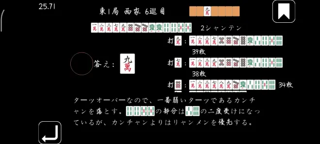 68m和46p的比较。23468m摸到5m能变成三面听,但是还是保留形成两面搭子的改良进张更多的46p。