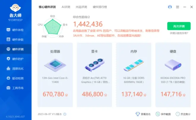 我的整机预算大约是8000元,主板是B760I迷你小雕,这块主板我一直有所关注,早先只有D4版,一直忍啊忍,D5版终于来了!搭配i5-13400和intel Arc A770显卡组成炒鸡迷你的itx平台,主要用途是做视频后期,偶尔打打LOL。固态硬盘我没有选择如火如荼的长存+无缓的低价方案,而且选择了知名度很高的铠侠(它的前身就是东芝存储器),1TB原厂颗粒带独立缓存的SE10,带5年质保还是很让人放心去用的。