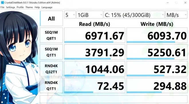 官方给出的跑分数据是7300MB/s和6400MB/s,AS SSD这里实测数据跟标称的有些差距,总分达到了7832,还是很不错的。