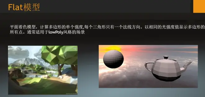 Gourand模型计算顶点光照并通过增量法插值计算多边形内部的光强,当顶点密度低时,表现效果很差,对于高