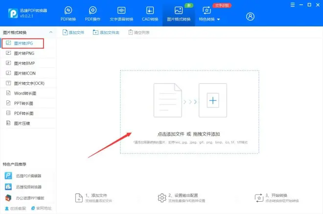 打开软件操作界面,点击页面上方选择“图片格式转换”,再点左侧选择“图片转JPG”,并把图片文件导入到软件中;