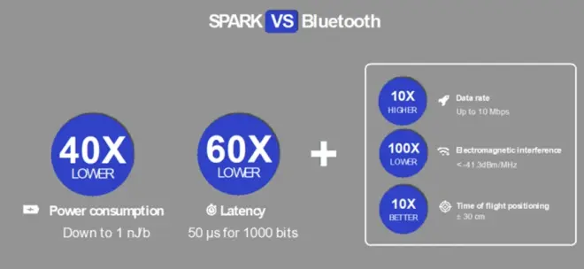 根据SPARK官网信息,其UWB技术能够在保证性能的情况下,拥有比蓝牙更低的功耗。据了解,与BLE相比,该技术的能效提高了40倍,延迟降低了60倍,数据吞吐量提高了10倍。此外,获得专利的Spark UWB无线电不会干扰其他窄带无线电,如WiFi、BLE、Zigbee、Z-Wave和蜂窝频带。