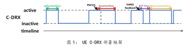 UE C-DRX的主要目的之一是周期性地唤醒UE以监视PDCCH。为了实现这一点,UE C-DRX具有基本的周期性活动/非活动模式,包括周期持续时间、开始偏移和周期中的基本活动时间(即onDurationTimer)。同时,对于某些情况,在基本活动/非活动模式(例如,用于重传的PDCCH)之外需要额外的PDCCH监控,因此,UE C-DRX还包括基于定时器的机制来扩展ON模式(例如InactivityTimer、RetransmissionTimer),如图1所示。